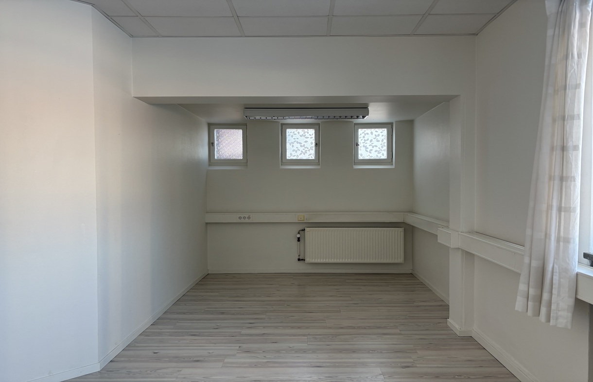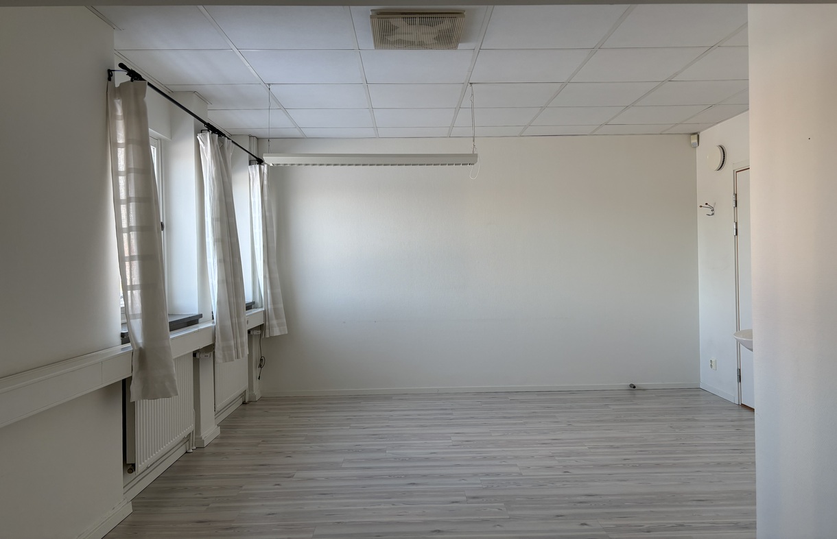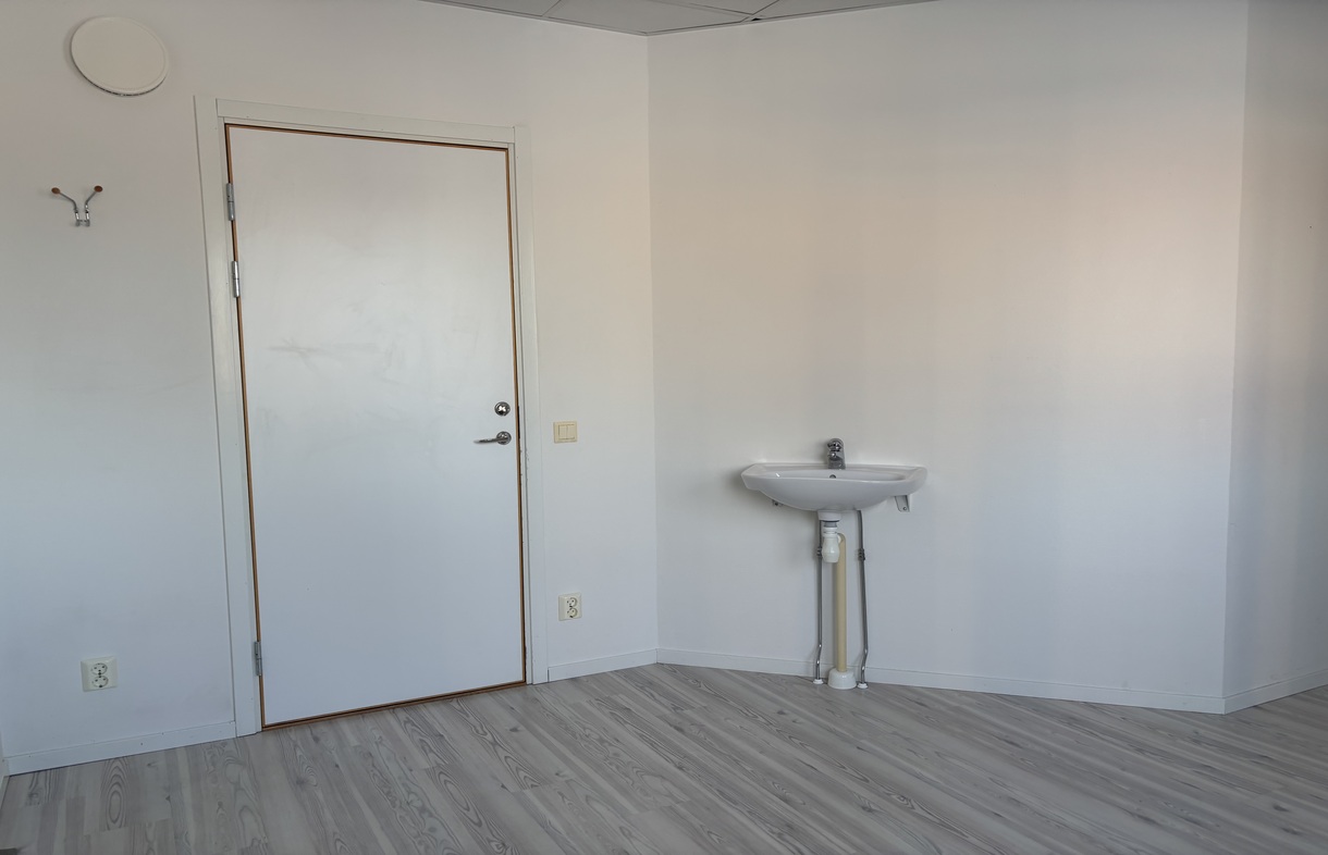 Rummet har ljusa väggar och ljust golv. Två stora fönster ger ett fint ljusinsläpp. Handfat är installerat. Passar utmärkt som kontor eller behandlingsrum.
